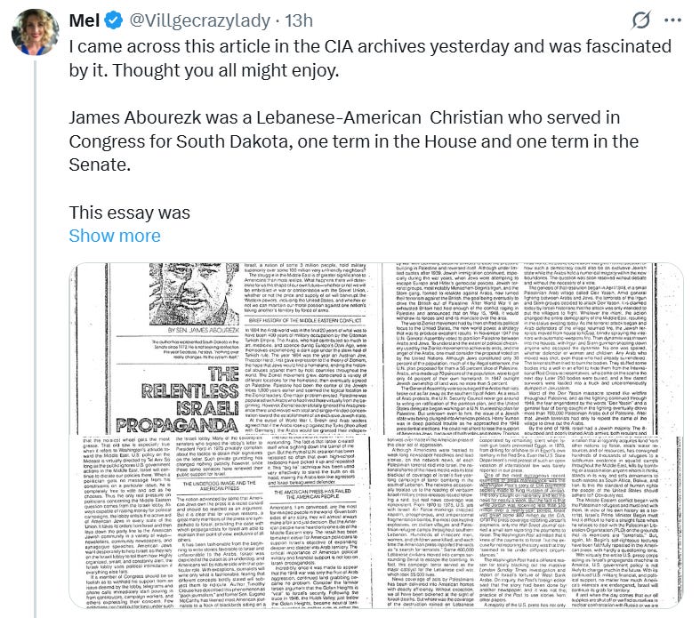 Abourezk left the Senate in 1979, deciding not to run for reelection. He focused on advocating for civil rights for Arab Americans, creating the American-Arab Anti-Discrimination Committee. His work in this realm was not without controversy: In 2007, he told a Hezbollah-backed TV news station that Zionists had helped orchestrate the 9/11 attacks as a plot to sow Islamophobia, and that Zionists controlled the U.S. Congress. [My Emphasis.]